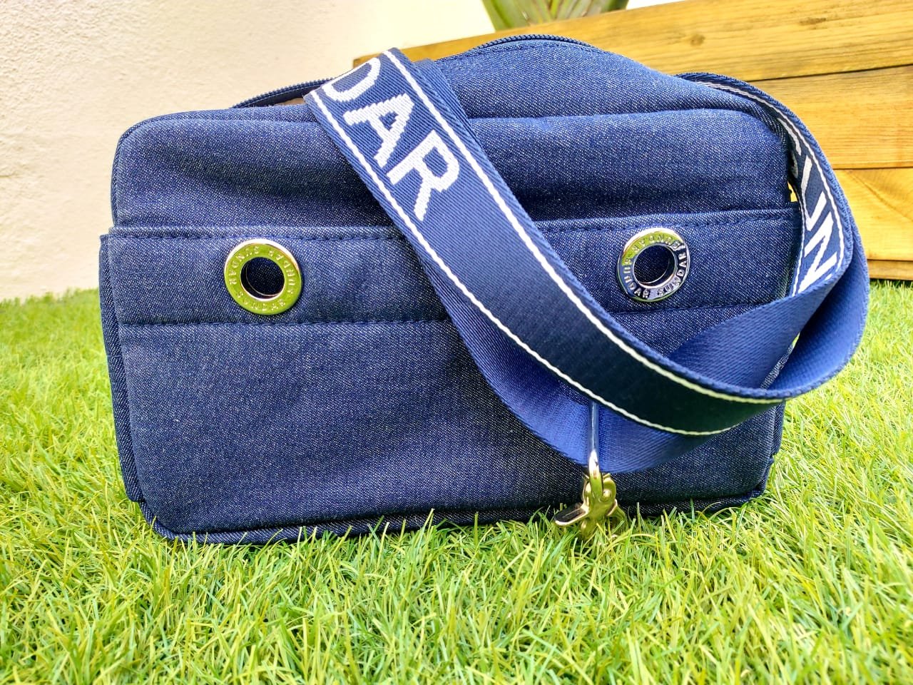 Bolsa Crossbody Laura mezclilla, con asa larga ribbon azul con blanco
